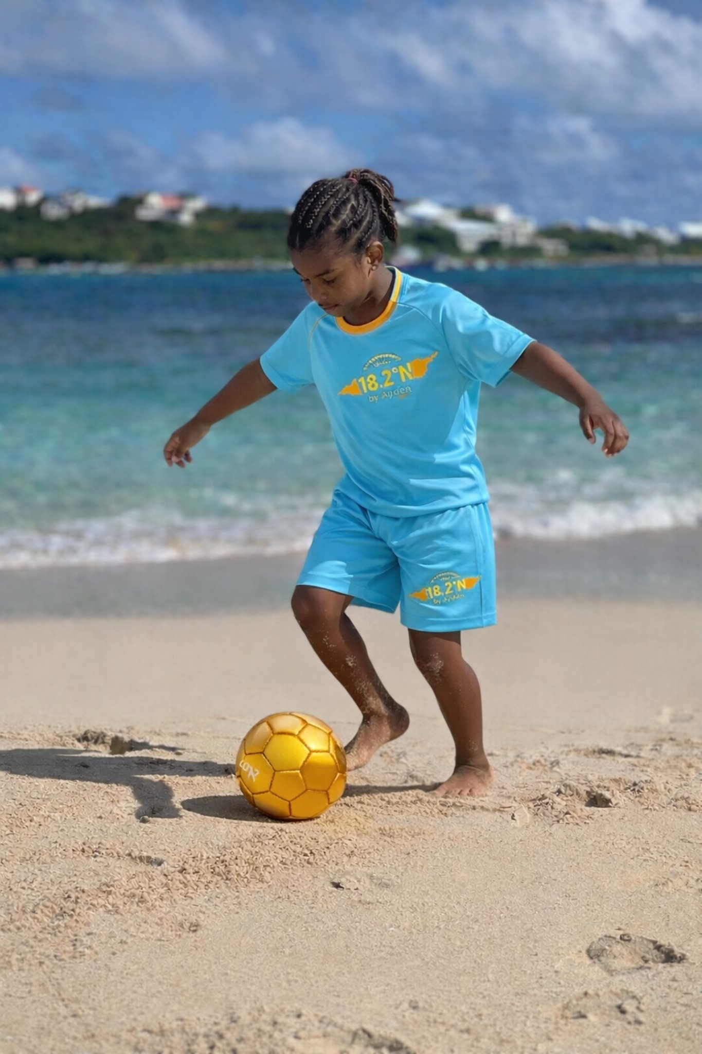 The collection includes football gear, rashguards for sun and swimming, hats, and beach wraps — all inspired by movement, island life, and young athletes with big dreams.